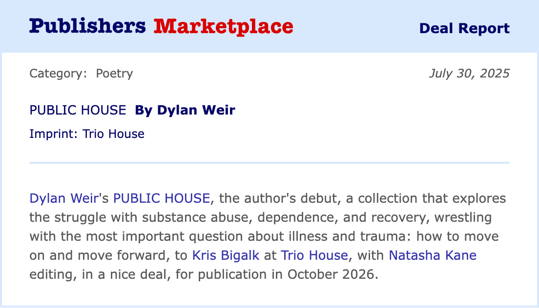My debut collection, Public House, will be published in 2026. Stay tuned for updates.